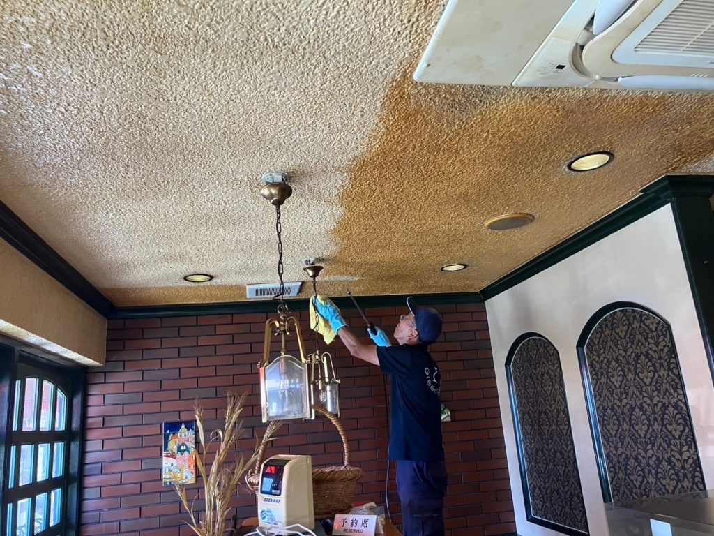 天井壁の塗り替えリフォームを行う工務店様から、ヤニ浮きやタバコ臭軽減処置ができないかと相談を受け、天井・壁・窓・床・店内家具や什器もタバコ専用の消臭清掃、エアコンの分解洗浄を行いました。